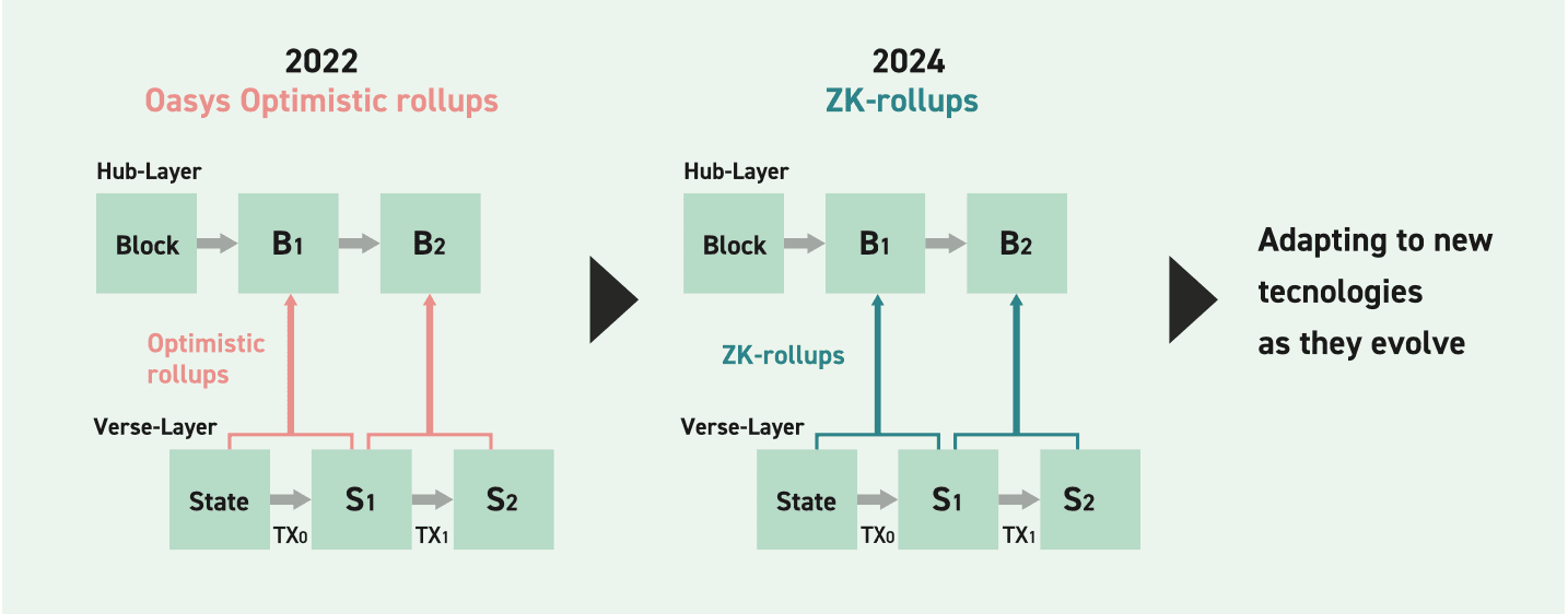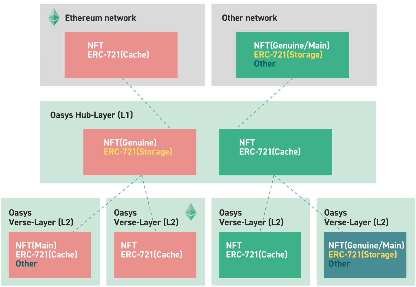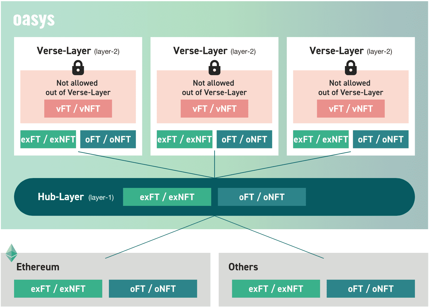 As an EVM-compatible protocol, Oasys' architecture is made up of a multi-layered structure comprising of Hub-Layer, a highly scalable Layer 1, and Verse-Layer, a special Layer 2 that utilizes Ethereum's Layer 2 scaling solution.